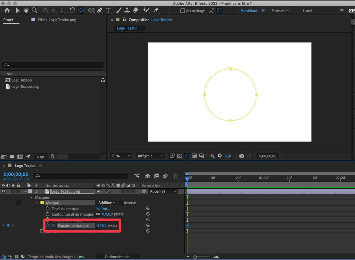 Pour faire l'effet que nous désirons (faire apparaitre le logo dans un cercle qui s'élargit), dans un premier temps, baissons la taille en pixels dans "Expansion de masque" jusqu'à ce que notre image ne soit plus visible.