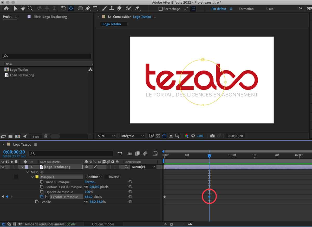 En déplaçant le curseur, du début de la time-line jusqu'à la seconde image clé (à 20f), vous constatez que le logo apparait grâce à l'évolution de la forme de notre masque.